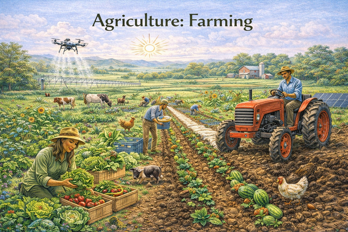 Agriculture farming is the cultivation of land, plants, animals, and aquatic systems to produce food, fiber, and other essential resources. In regenerative and circular models, agriculture is not just production, it is the management of living ecosystems, where soil, water, plants, animals, and microorganisms function together in continuous nutrient and energy cycles. Historical agricultural systems in the ancient Tamil region demonstrate early forms of regenerative circular farming, characterized by nutrient recycling, mixed cropping, livestock integration, and sophisticated water management practices that sustained soil health over centuries. Modern agriculture includes integrated systems such as: